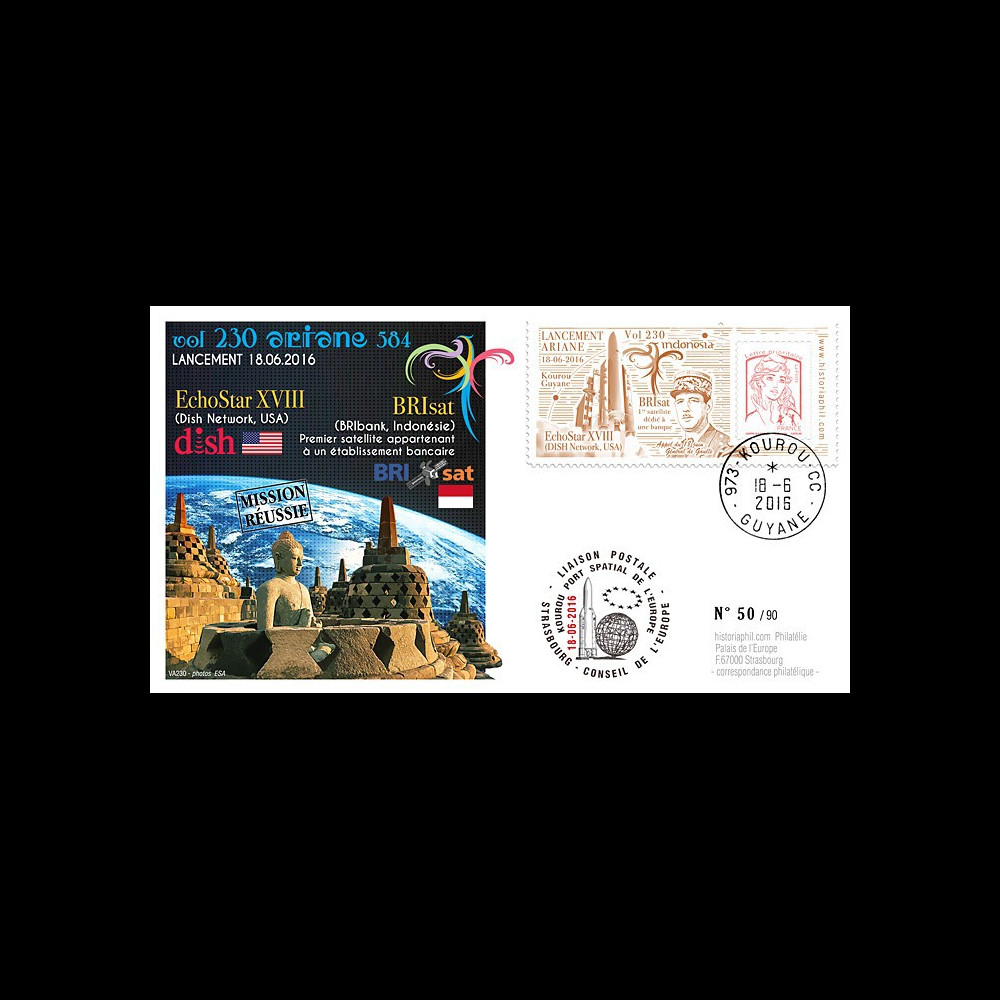 N°VA230L-T1 : FDC KOUROU (Guyane française) "18.06.2016 : Lancement Fusée ARIANE 5 ECA - Version 584 - Vol n°230 / Mise en orbite des satellites de télécommunications Echostar XVIII (Dish Network, USA) & BRIsat (BRIbank, Indonésie), premier satellite appartenant à un établissement bancaire" (TYPE 1)