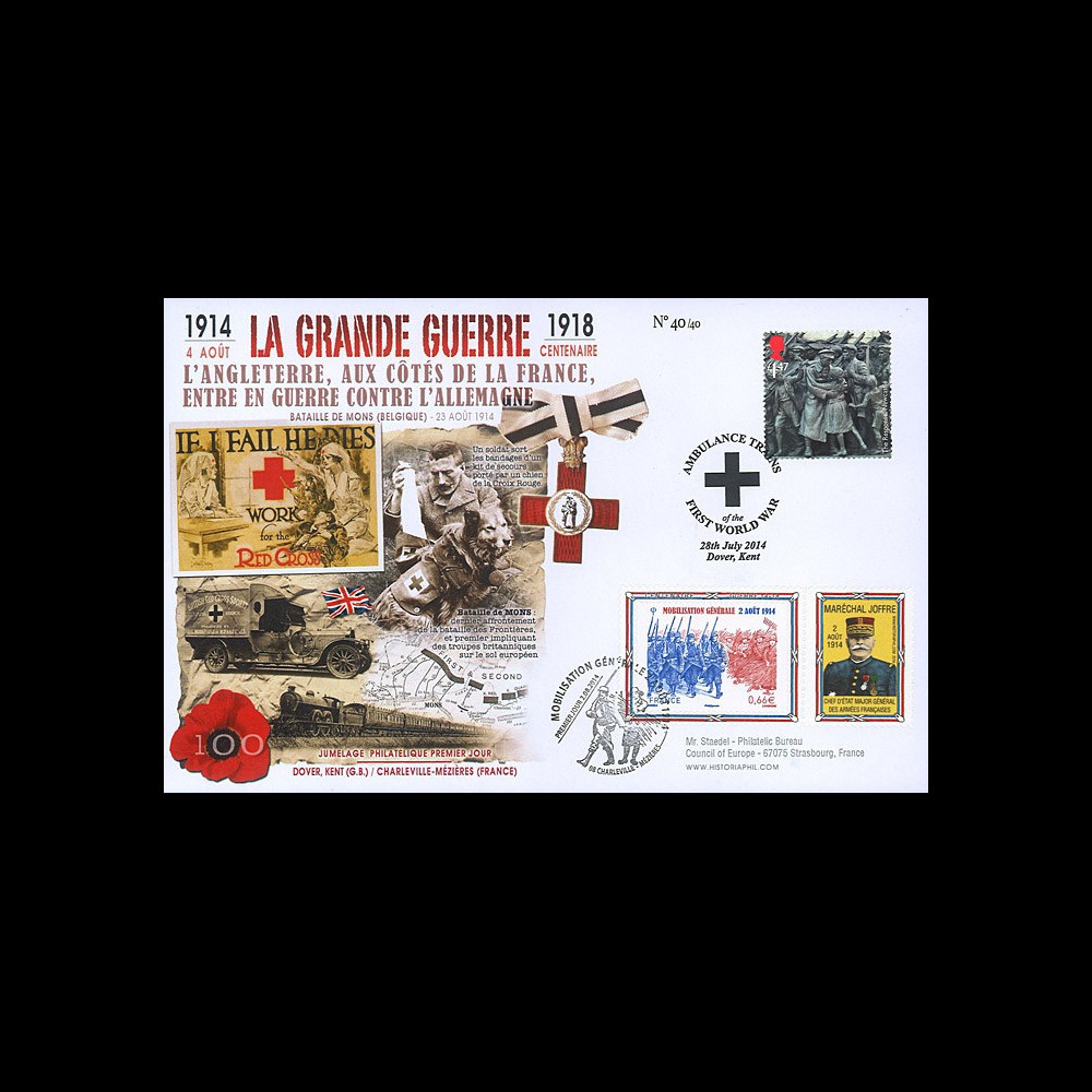 N°CENT14-9 : Maxi FDC ROYAUME-UNI - FRANCE "28.07.2014 : Premier Jour à Dover (Kent, Royaume-Uni) - Centenaire de la Grande Guerre - Croix Rouge / 02.08.2014 : Premier Jour à Charleville-Mézières (France) - Centenaire de la Mobilisation Générale des Troupes françaises / L’Angleterre, aux côtés de la France entre en Guerre contre l'Empire allemand / Bataille de Mons (Belgique) : Soldat avec un chien de la Croix Rouge - La Croix Rouge sur le front - Train ambulance / 1914-2014 : Centenaire de la Grande Guerre / Première Guerre Mondiale 1914-1918" (ft. 13,5 x 20,8 cm) 2014 :