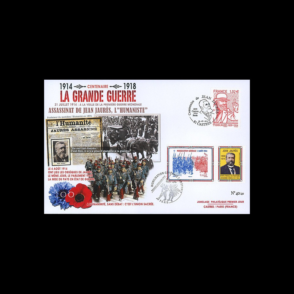 N°CENT14-19 : Maxi FDC FRANCE "31.07.2014 : Premier Jour à Castres (France) - Centenaire de l'Assassinat de Jean JAURES, Porte-parole du Pacifisme / 02.08.2014 : Premier Jour à Paris (France) - Centenaire de la Mobilisation Générale des Troupes françaises / 1914-2014 : Centenaire de la Grande Guerre / Première Guerre Mondiale 1914-1918" (ft. 13,5 x 20,8 cm) 2014 :