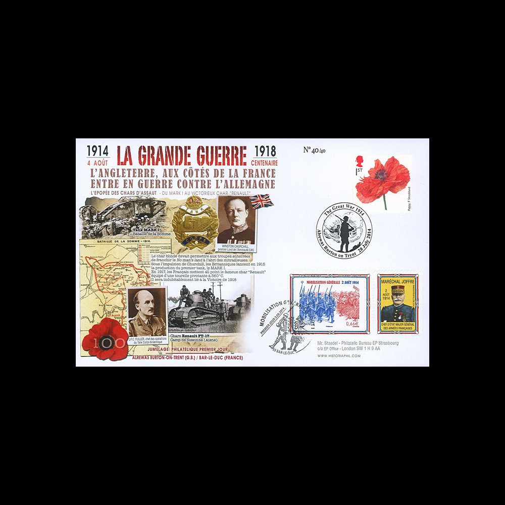 N°CENT14-11 : Maxi FDC ROYAUME-UNI - FRANCE "28.07.2014 : Premier Jour à Alrewas, Burton on Trent - Centenaire Grande Guerre / 02.08.2014 : Premier Jour à Bar-le-Duc - Centenaire Mobilisation Générale des Troupes françaises / W. CHURCHILL, Premier Lord de l'Amirauté du Royaume-Uni & MG J.F.C. FULLER, Chef opérations Tank Corps britannique & Mal. JOFFRE, Chef d'Etat Major Général des Armées françaises / Bataille de la Somme (France) - L'Epopée des Chars d'assaut : du Mark I au Char 'Renault' / Chars Renault FT-17 - Camp de Sissonne (France) / Première Guerre Mondiale 1914-1918" (ft. 13,5 x 20,8 cm) 2014 :