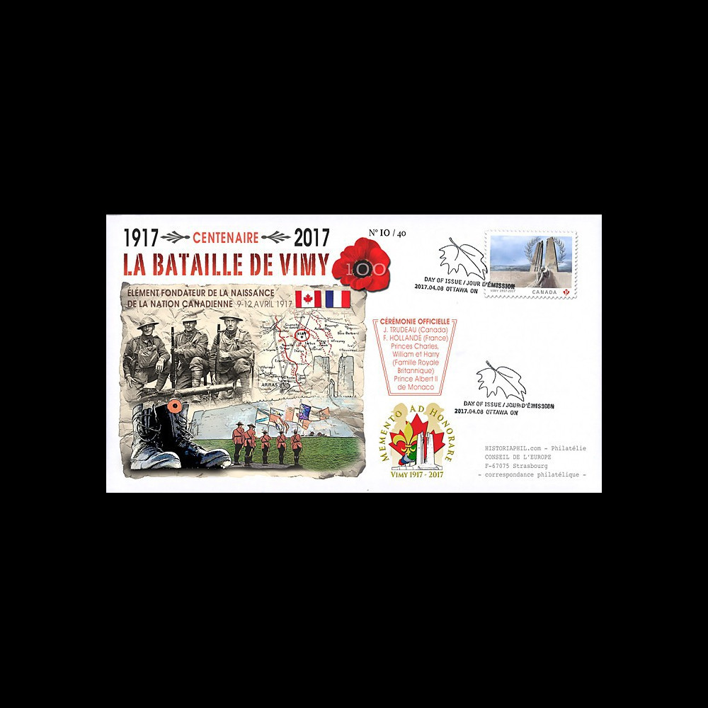CENT17-1T1 : FDC Premier Jour CANADA "Centenaire de la BATAILLE DE LA CRÊTE DE VIMY (Arras, France)"