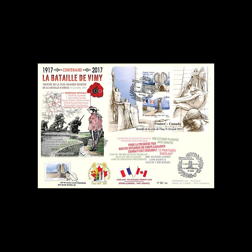 Oblitération 1er Jour Vimy "Emission commune FRANCE-CANADA" 08.04.2017