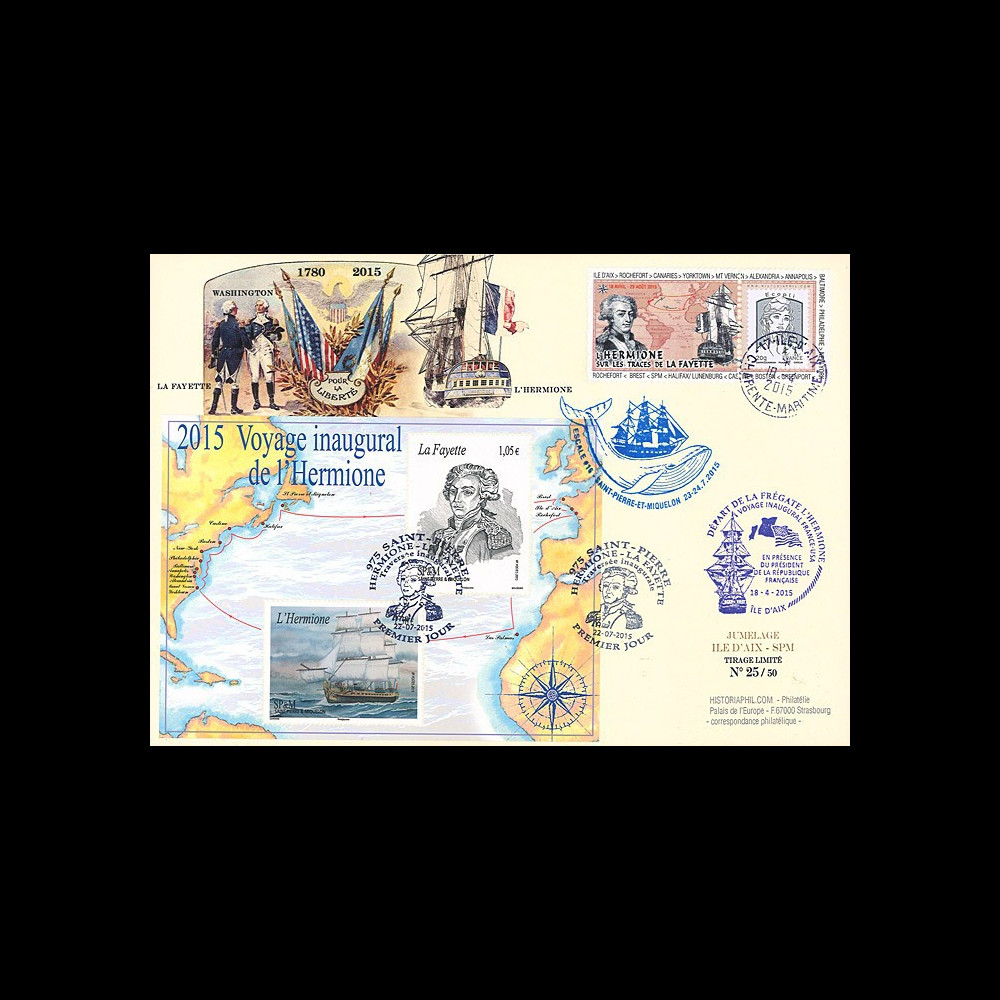 N°HLF15-19 : Maxi FDC FRANCE - SAINT-PIERRE ET MIQUELON "18.04.2015 : 235 ans après le Marquis de LA FAYETTE - Départ de l'Île d'Aix (France) de la Frégate de la liberté française l'HERMIONE vers les Etats-Unis (USA) - Cérémonie officielle à l'Île d'Aix (France) en présence de M. HOLLANDE, Président de la République française / 22.07.2015 : Premier Jour à Saint-Pierre (Saint-Pierre et Miquelon) - Traversée inaugurale HERMIONE - LA FAYETTE / 23-24.07.2015 : Escale de la Frégate L'HERMIONE à Saint-Pierre et Miquelon (France)" 2015 :