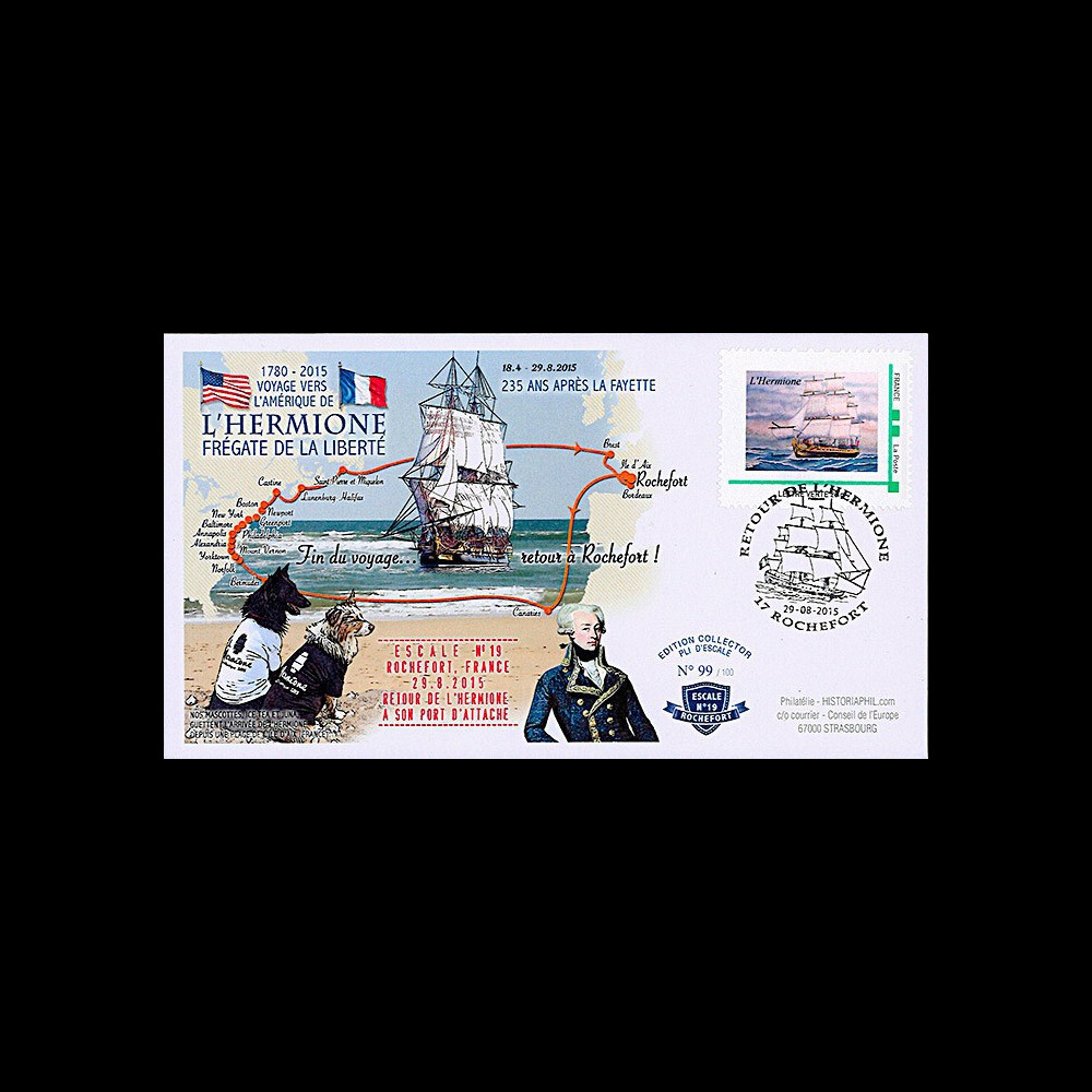 + cachet rouge Rochefort "Escale n°19 - Retour de L'Hermione à son Port d'attache" (France) 29.8.2015