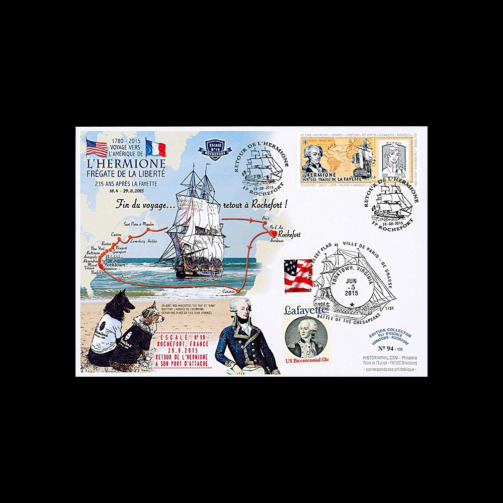 N°HLF15-24 : Maxi FDC USA - FRANCE "18.04-29.08.2015 : 235 ans après le Marquis de LA FAYETTE - Départ de l'Île d'Aix de la Frégate de la liberté française L'HERMIONE vers les Etats-Unis - Traversée inaugurale / 05-07 .06.2015 : Escale n°4 de la Frégate L'HERMIONE à Yorktown (USA) / 29.08.2015 : Escale n°19 à Rochefort - Cachet spécial - Retour de L'HERMIONE à son Port d'attache - Fin du Voyage / Les chiens ICE TEA (Berger belge) & JUNA (Berger australien) guettant le Retour de L'HERMIONE depuis une plage de l'Île d'Aix" (ft. 16,2 x 22,9 cm) 2015 :