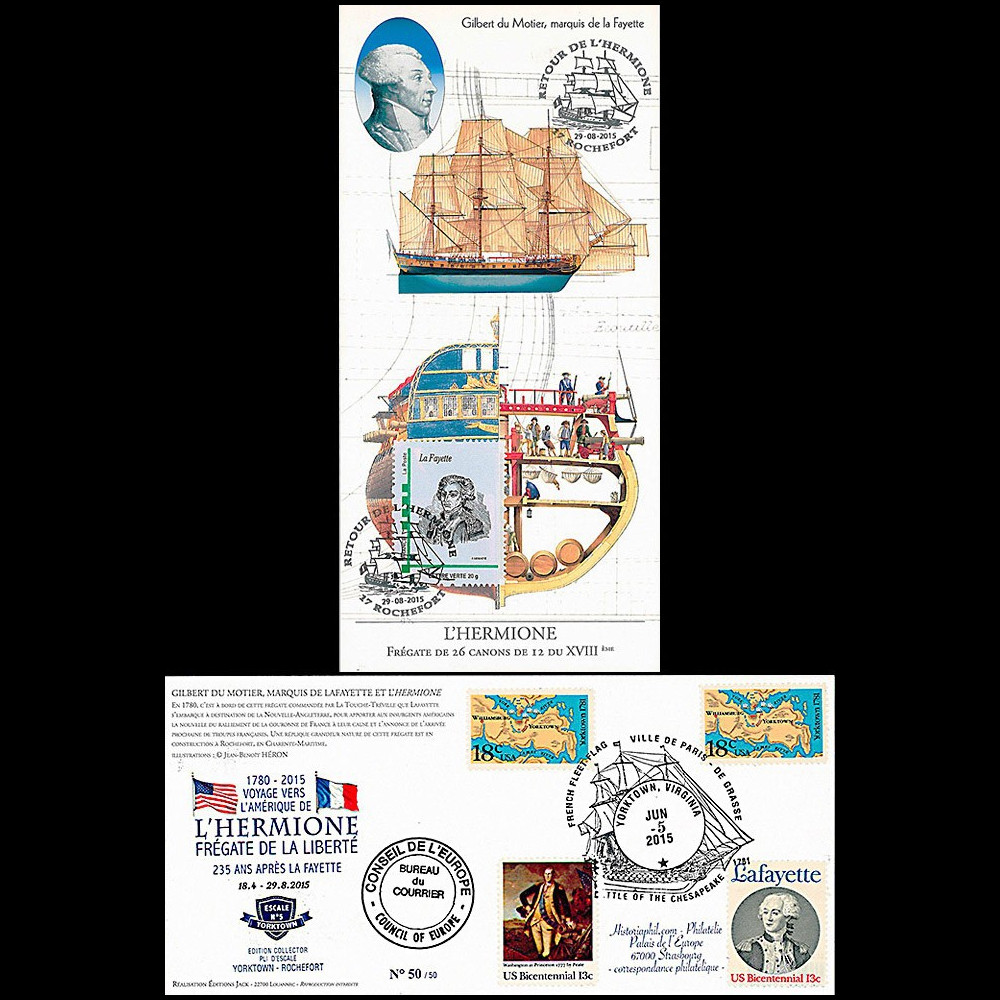 N°HLF15-25 : Carte Maximum de Luxe USA - FRANCE "18.04-29.08.2015 : 235 ans après le Marquis de LA FAYETTE - Départ de l'Île d'Aix (France) de la Frégate de la liberté française L'HERMIONE vers les Etats-Unis (USA) - Traversée inaugurale / 05-07 .06.2015 : Escale n°4 de la Frégate L'HERMIONE à Yorktown (Virginie, USA) / 29.08.2015 : Escale n°19 à Rochefort (France) - Cachet spécial - Retour de L'HERMIONE à son Port d'attache - Fin du Voyage" 2015 :
