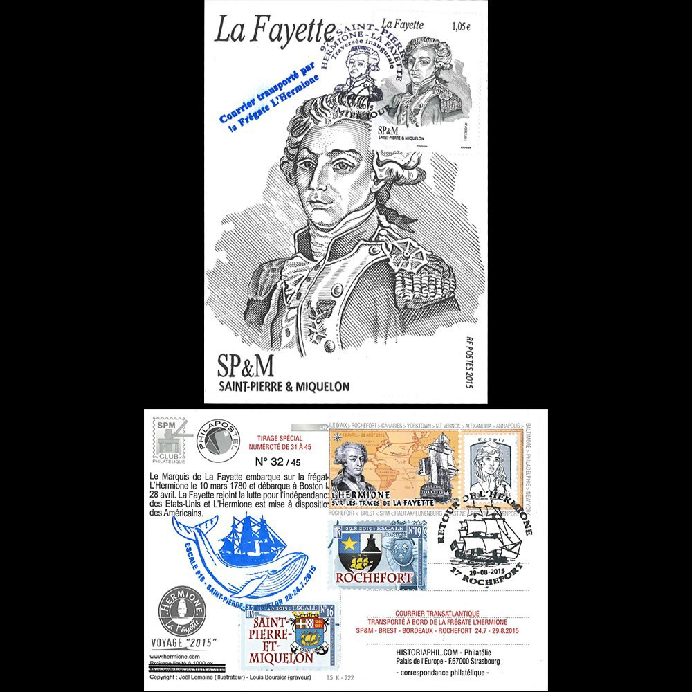 1) Affrt. Départ SPM 1,05€ “La Fayette“ issu du bloc “2015 Voyage inaugural de L’Hermione“ oblit. Saint-Pierre "1er Jour - Traversée inaugurale Hermione" 22.7.2015