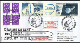 Chaque enveloppe spéciale est oblitérée «Kourou - Guyane» du jour du lancement d’ARIANE.