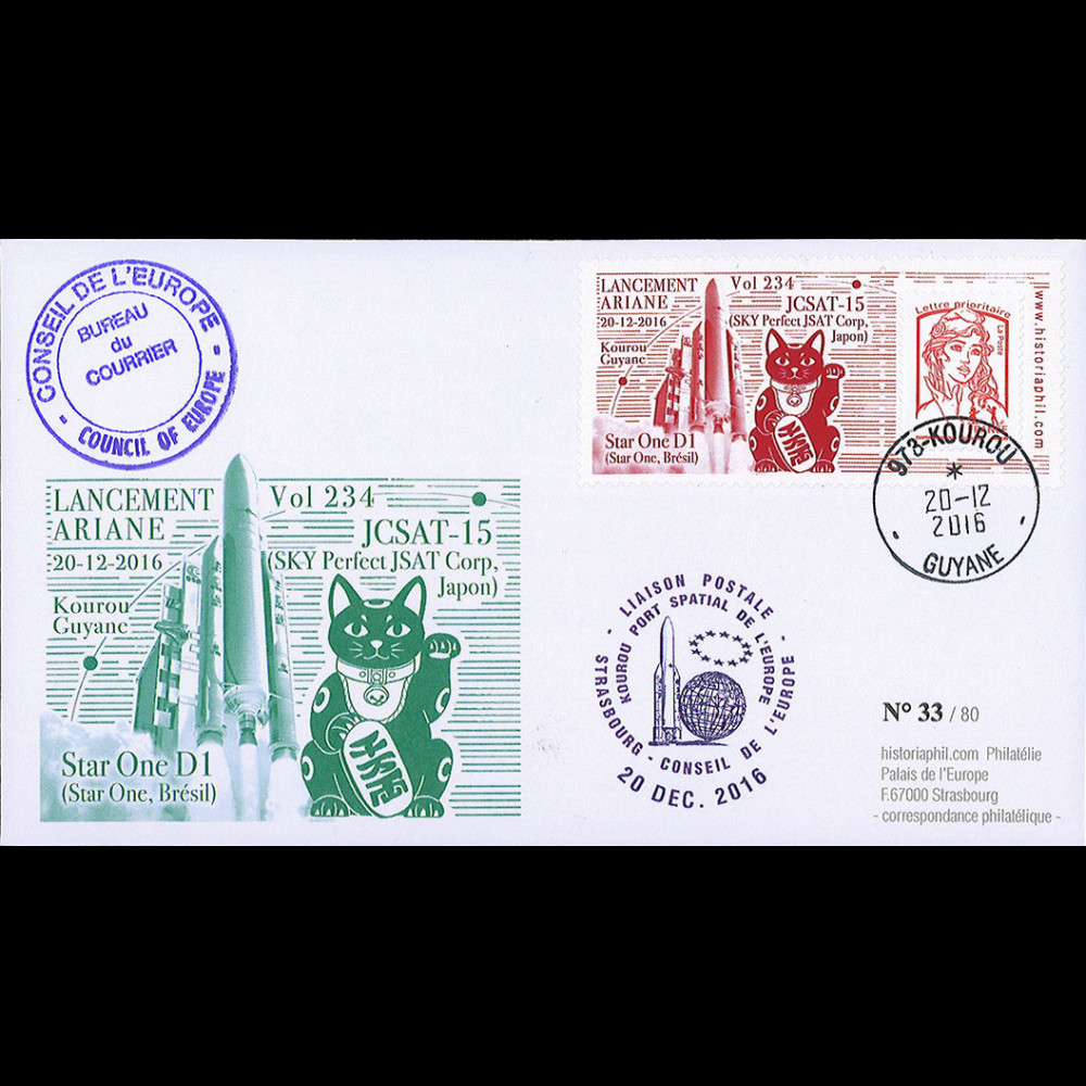 Affranchissement TYPE 1 : France Lettre prioritaire 20g rouge "Marianne et la Jeunesse" sur porte-timbre privé "Kourou (Guyane), 20.121.2016 : Lancement Fusée Ariane Vol 234 / Star One D1 (Brésil) et JCSAT-15 (Japon)"