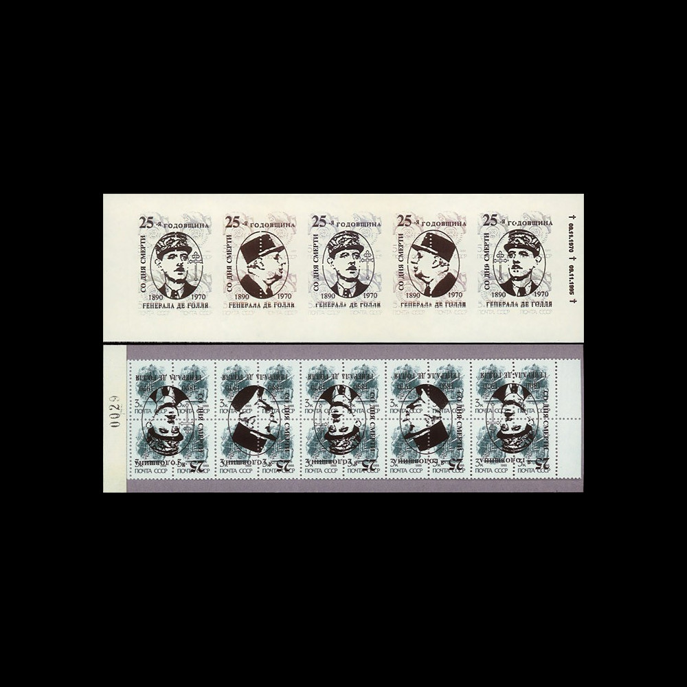 N°DG95-RU1CR : Carnet 20 x 3k vert URSS 1988 "Croiseur Aurora" surcharge renversée "1970-1995, 25e anniversaire de la mort du Général de Gaulle"
