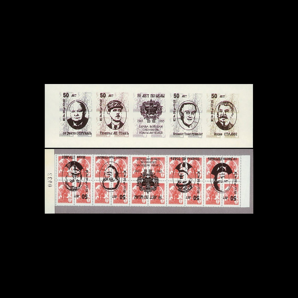 N°VICT95-RU3CR : 1995 Carnet 20 x 3k rouge URSS 1976 "Marteau et faucille" surcharge renversée "50 ans Victoire de 1945, Churchill, de Gaulle, Roosevelt, Staline"