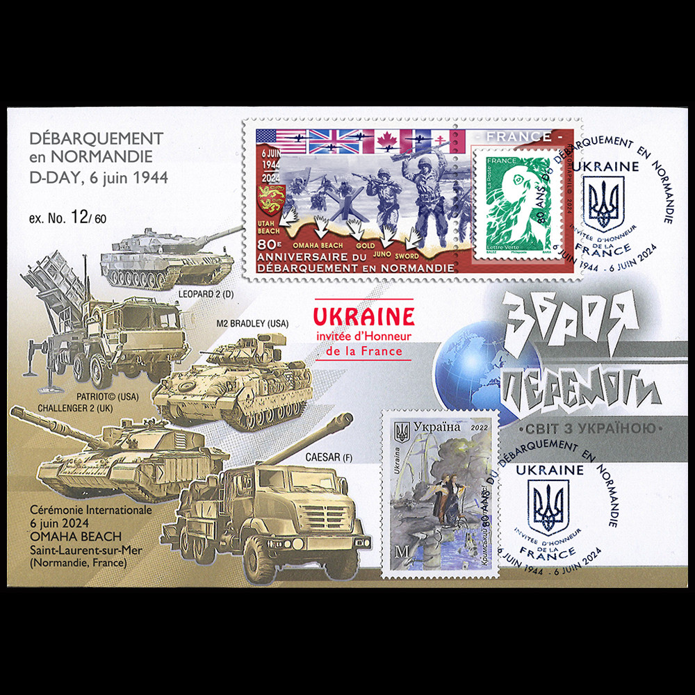 - Cachet philatélique illustrée “80 ans Débarquement Normandie - 6 juin 1944/2024 - UKRAINE Invitée d’Honneur de la France"