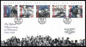 - Affranchissement 5 valeurs : 16p “Winston Churchill“, 24p “Navires Alliés le matin du 9 mai 1945“, 35p “Fanfare militaire“, 41p “Navire-hôpital de la Croix Rouge SS Vega“, 60p “le baiser au Tommy“ .