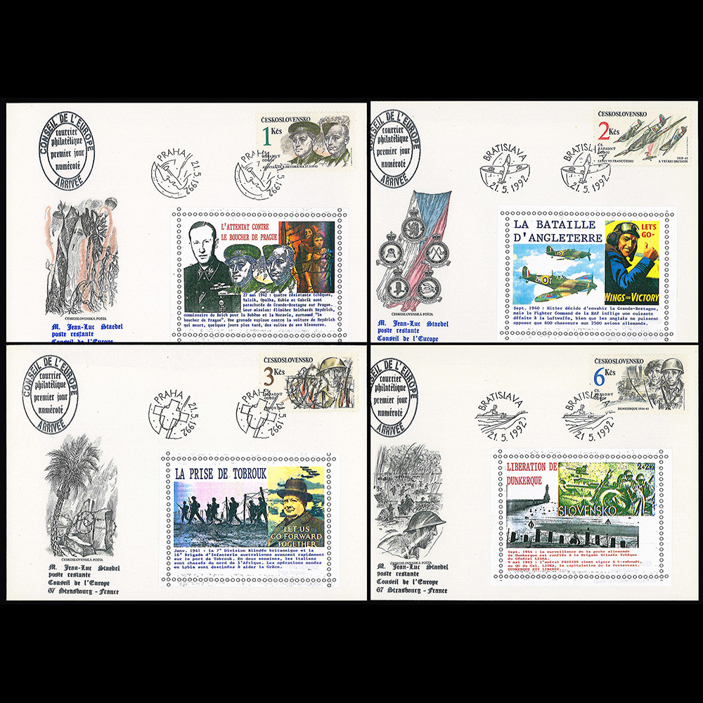 LIB95-CZ : 4 FDC Tchécoslovaquie 1992 “Soldats, pilotes et résistants tchécoslovaques dans les combats pour la Libération de l’Europe, 1939-1945“