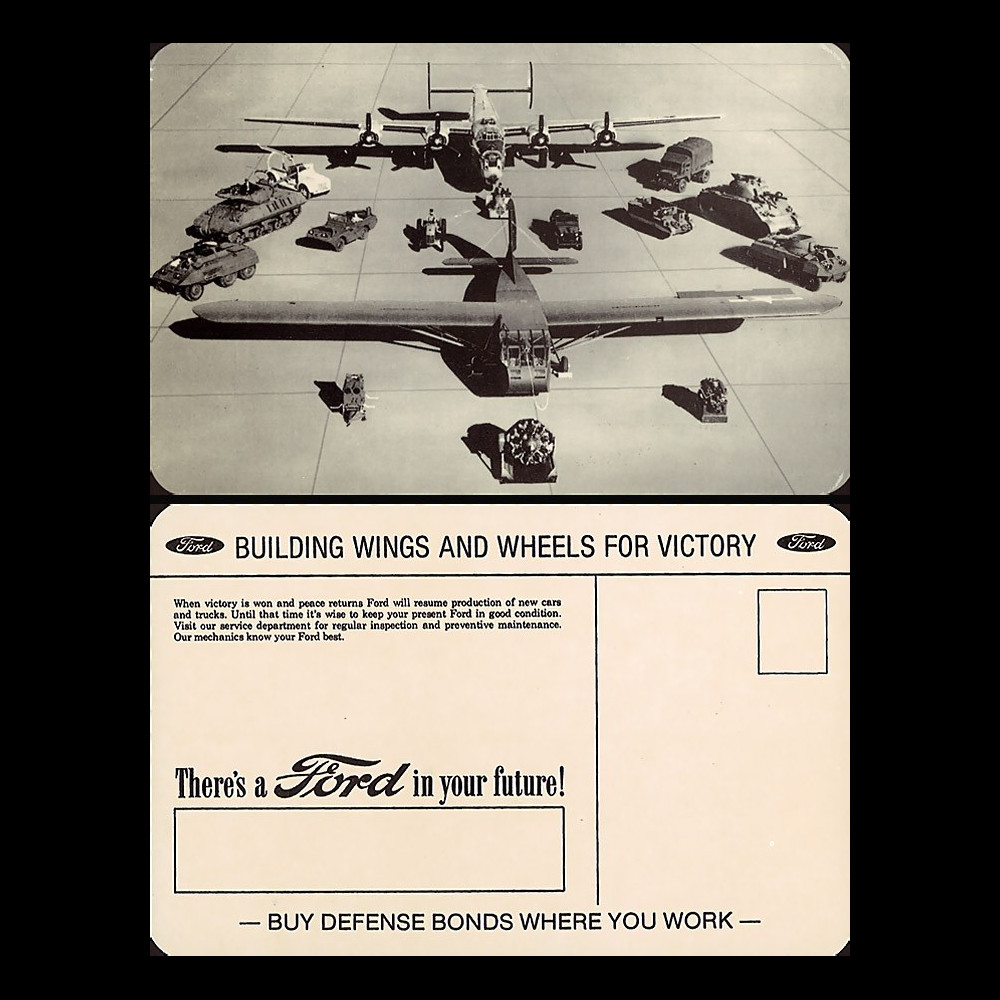 - Réédition d'après-guerre des cartes postales patriotiques américaines émises par la direction des usines Ford. Elles demandaient aux ouvriers de Ford et à leurs familles d'acheter des BONS D'ARMEMENT POUR LA VICTOIRE. Format 178 x 114 mm