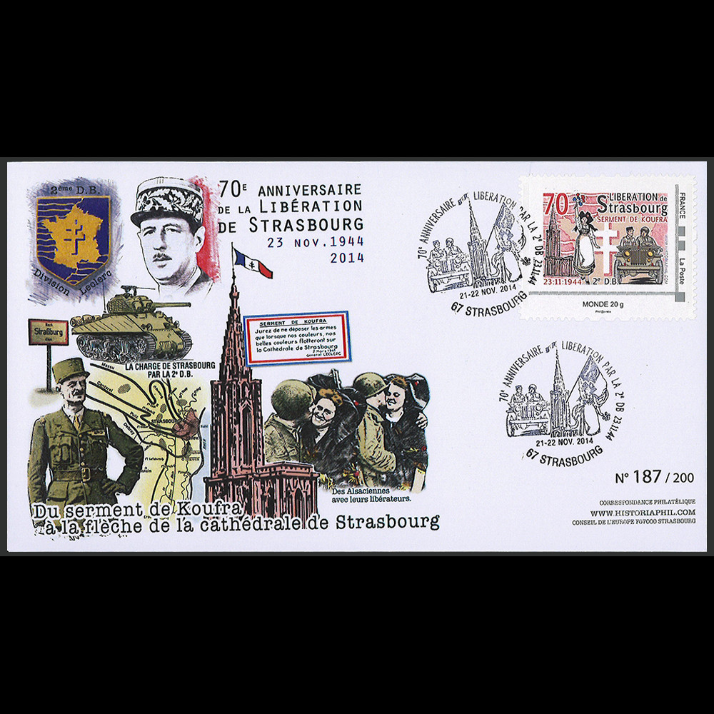 LIB14-STR3 : FDC Edition COLLECTOR (Premier Jour) "23.11.2014 : de Gaulle - Leclerc, 70e anniversaire de la Libération de Strasbourg, du Serment de Koufra à la flèche de la cathédrale de Strasbourg"