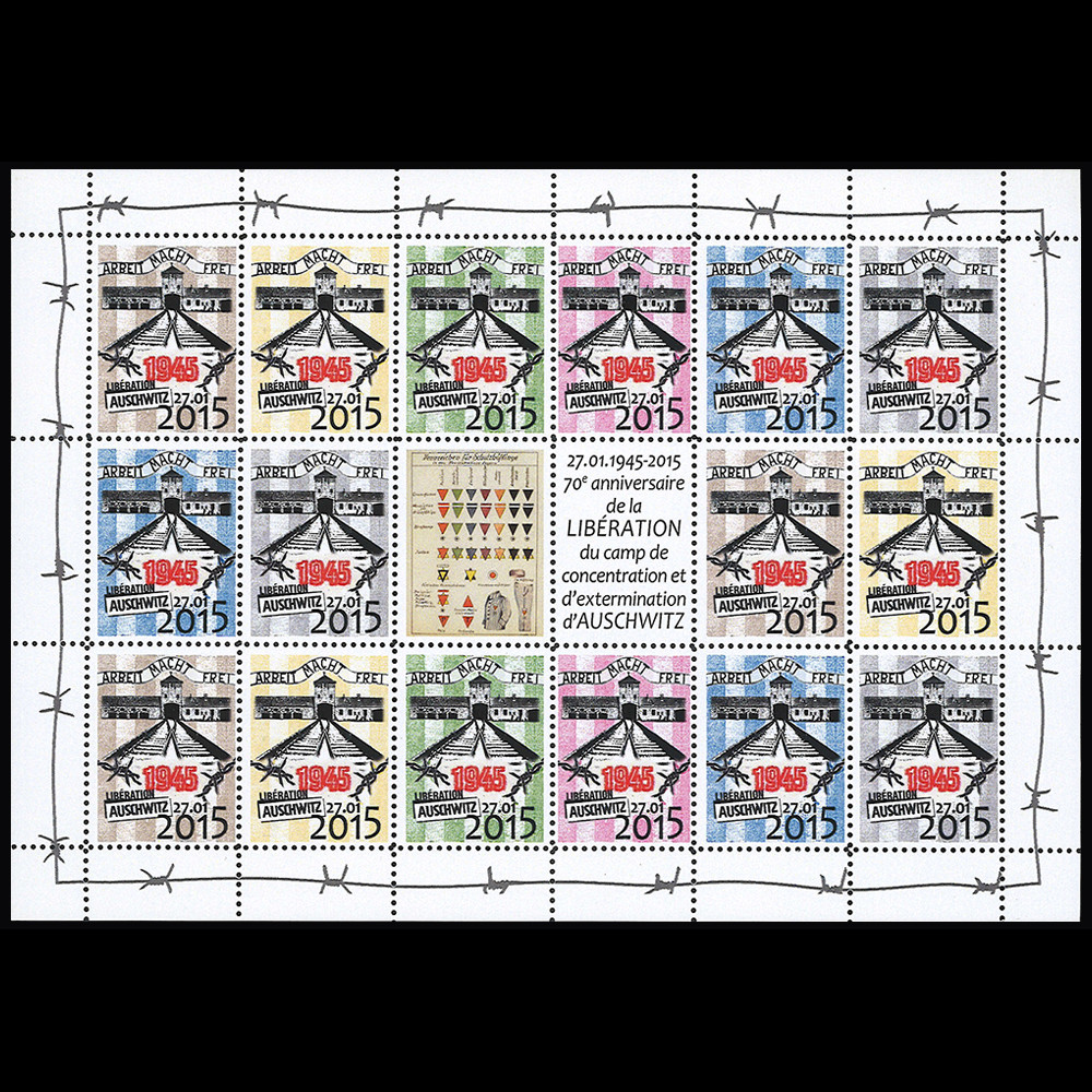 PE669-FD : Feuillet de 18 vignettes dentelées et gommées "27.01.2015 : 70e anniversaire de la libération du camp de concentration et d'extermination nazi d'Auschwitz-Birkenau (Oswiecim / Pologne) 1945-2015". Emis pour les cérémonies de commémoration du Parlement européen et du Conseil de l'Europe à Strasbourg (France)