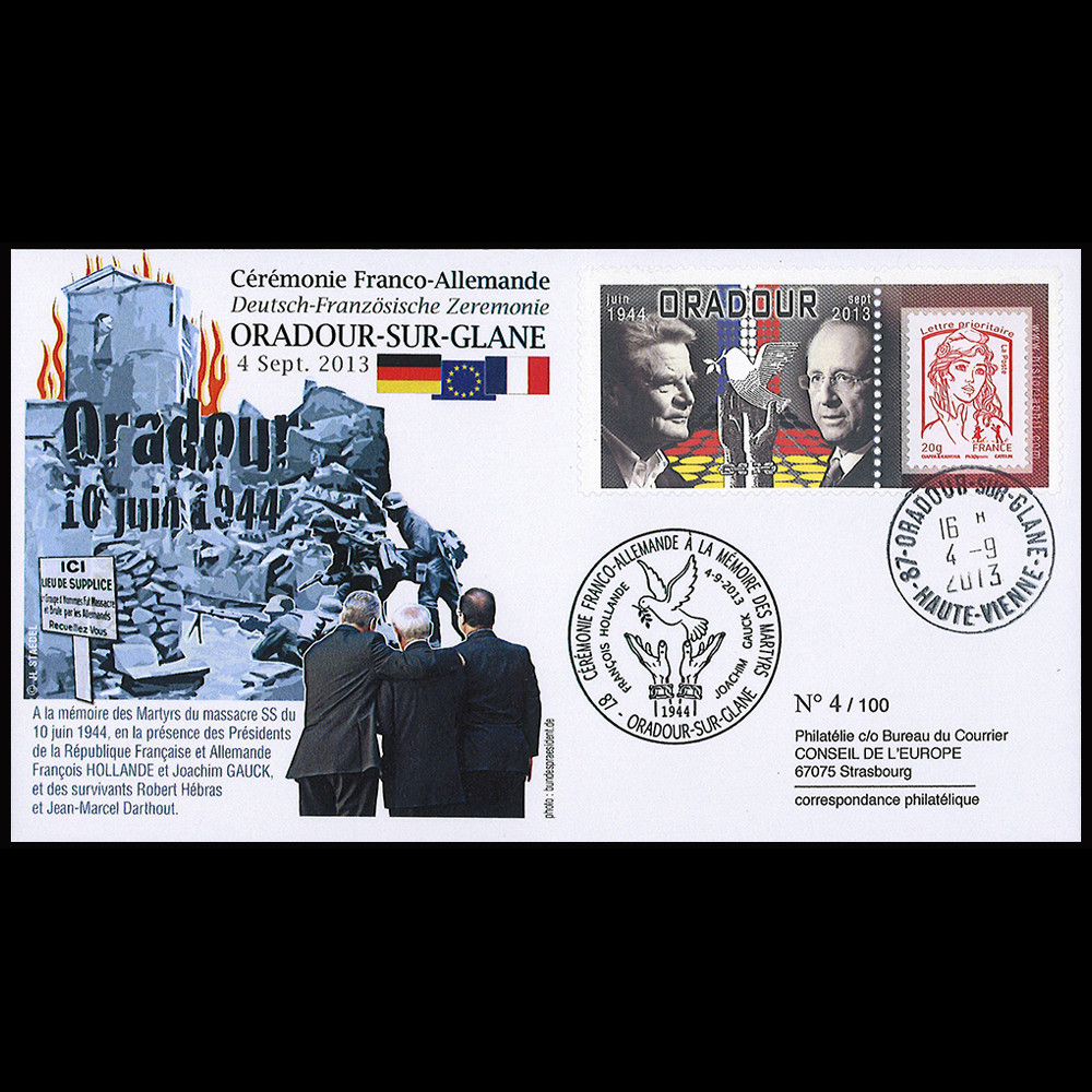 - Cachet noir "Oradour-sur-Glane - Cérémonie Franco-allemande à la Mémoire des Martyrs - M. François HOLLANDE et M. Joachim GAUCK - Colombe de la Paix" (France) 04.09.2013