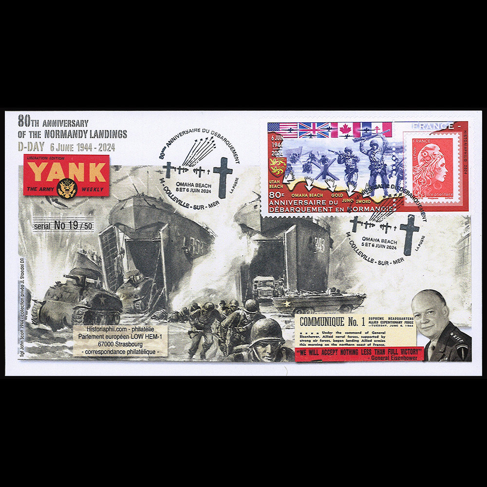 - oblit. illustrée Colleville-Sur-Mer “80e anniversaire du Débarquement - Omaha Beach - Croix du cimetière américain et Patrouille de France“ 5-6 juin 2024