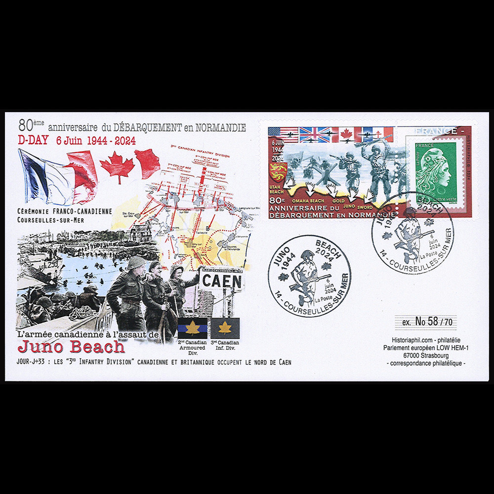- oblit. illustrée Courseulles-sur-Mer “JUNO BEACH 1944 - 2024 - Soldat de la 3rd Canadian Infantry Division“ 6 juin 2024