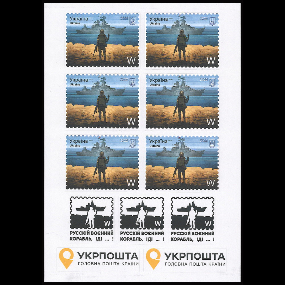 Le timbre de guerre “Russian Warship / Navire de guerre russe, allez vous faire foutre!“, avait également été émis par les Postes ukrainiennes en feuillet adhésif de 6 vignettes (sans valeur d’affranchissement) + 3 vignettes en noir.
