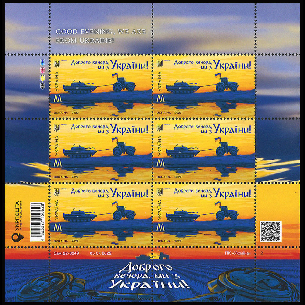 Un concours avait été lancé dans les mois qui ont suivi l’invasion militaire russe de l’Ukraine, pour choisir le motif d’un nouveau “timbre de guerre“. La phrase “Bonsoir, nous venons d’Ukraine“ avait été choisie par la population ukrainienne comme étant l’appel pour symboliser sa résistance à l’envahisseur. C’est le dessin d'Anastasia Bondarets, un tracteur ukrainien remorquant un char russe détruit, qui a remporté la victoire incontestée. 900 000 personnes avaient participé au vote. Selon l'auteure, son dessin symbolise le fait que chaque Ukrainien, en vertu de ses propres capacités, fait tout son possible pour rapprocher son pays de la Victoire.