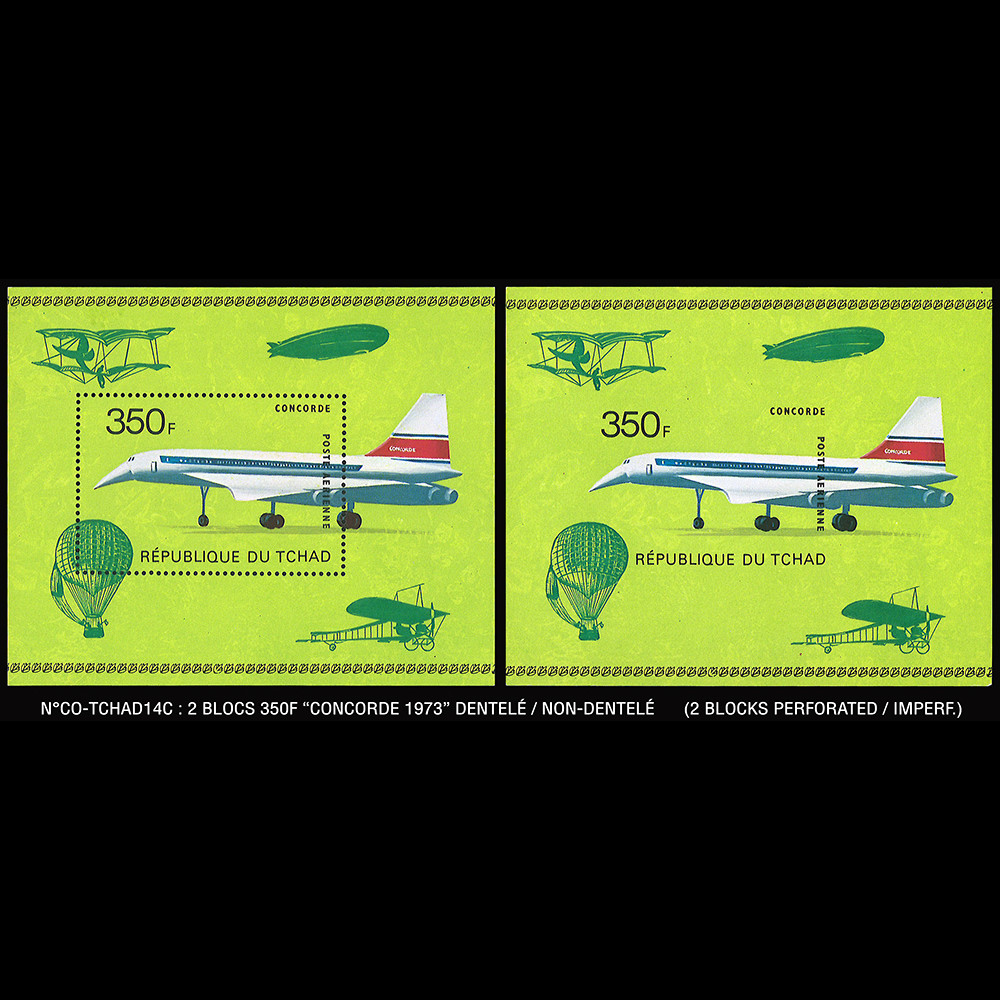 N°CO-TCHAD14C: 1973 - Republic of CHAD - 2 Souvenir sheets (Perf. / Imperf.) 350F “Air Mail - Last test flight of the prototype CONCORDE 001 (F-WTSS) 01.08.1973 - Hot air balloon, Plane of Clément Ader, Zeppelin airship, Plane of Louis Blériot“ - MINT (MNH)