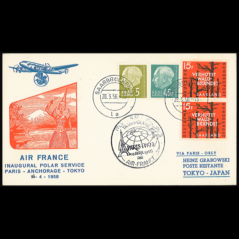 À l’occasion du “Vol inaugural Transpolaire Paris-Anchorage-Tokyo 10-12.04.1958”, Air France organisait l’acheminement de courrier aérophilatélique au départ de Paris. Alors que la grande majorité des correspondances étaient affranchies de timbres français, Paul Staedel et Heinz Grabowski, spécialistes de la Sarre et de la Poste aérienne, firent acheminer un petit tirage d’enveloppes affranchies de timbres de la Sarre, qui depuis 1957 est rattachée politiquement à la RFA, mais dont les timbres-poste portent l’inscription “Deutsche Bundespost” et leur valeur faciale exprimée en “Francs Français”.