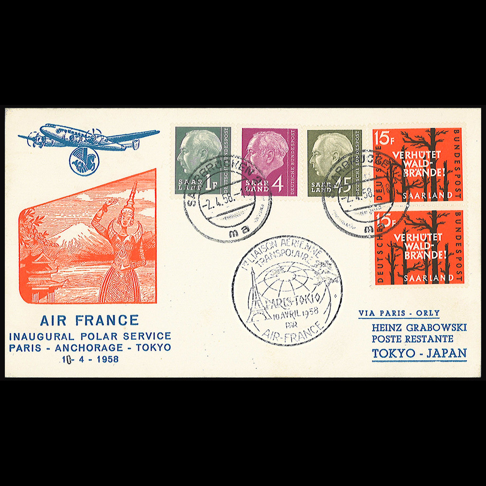 From April 10 to 12, 1958, on the occasion of the “Inaugural Transpolar Flight Paris-Anchorage-Tokyo”, Air France organized the delivery of aerophilatelic mail from Paris. While the vast majority of correspondence was franked with French stamps, Paul Staedel and Heinz Grabowski, specialists in the Saarland and airmail, sent a small print run of envelopes franked with Saarland stamps, which had been politically attached to the FRG since 1957, but whose postage stamps bore the inscription “Deutsche Bundespost” and their face value expressed in “French francs”.