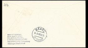 À l’occasion du “Vol inaugural Transpolaire Paris-Anchorage-Tokyo 10-12.04.1958”, Air France organisait l’acheminement de courrier aérophilatélique au départ de Paris. Alors que la grande majorité des correspondances étaient affranchies de timbres français, Paul Staedel et Heinz Grabowski, spécialistes de la Sarre et de la Poste aérienne, firent acheminer un petit tirage d’enveloppes affranchies de timbres de la Sarre, qui depuis 1957 est rattachée politiquement à la RFA, mais dont les timbres-poste portent l’inscription “Deutsche Bundespost” et leur valeur faciale exprimée en “Francs Français”.