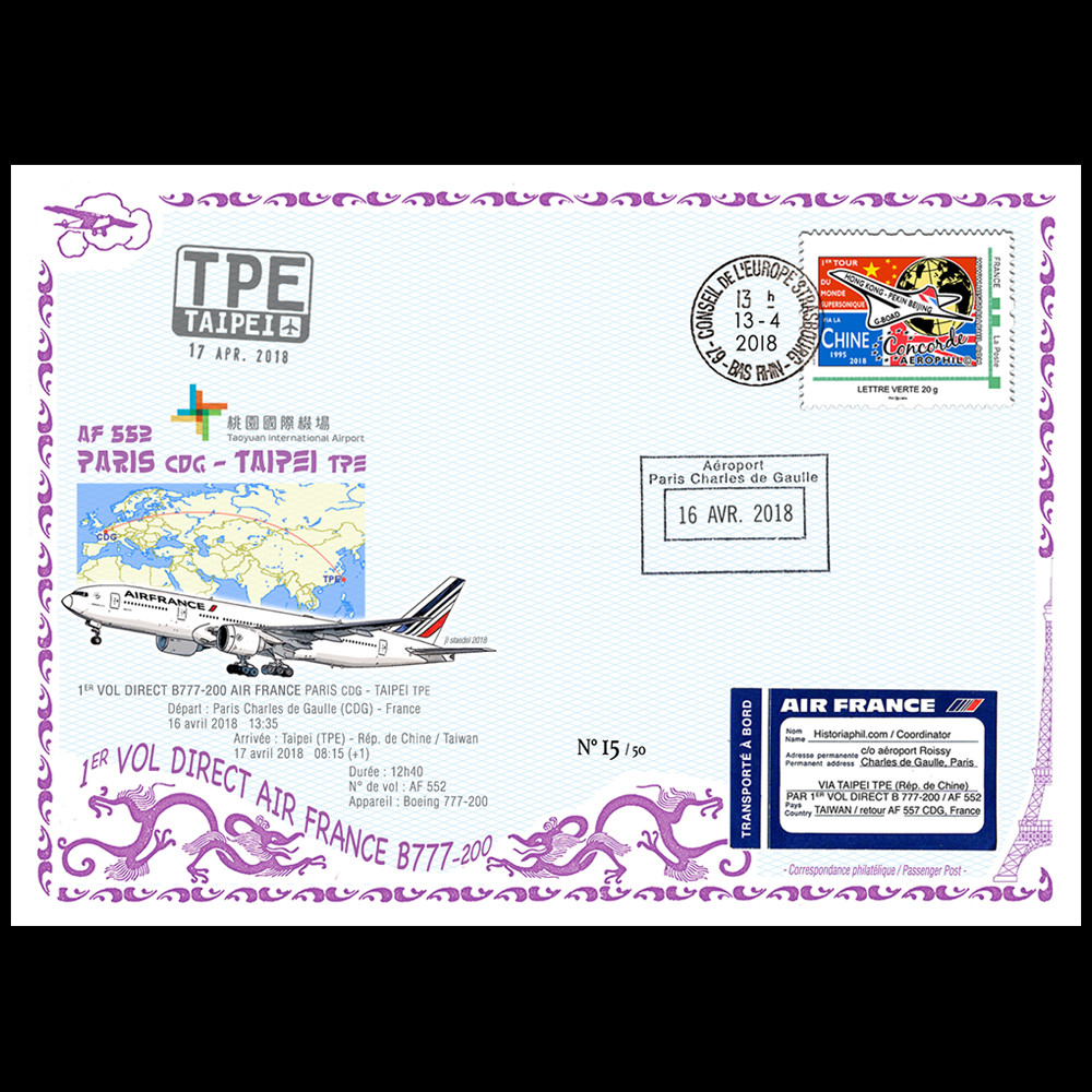 CO-RET94M : Pli (C5) transporté à bord du “Vol inaugural direct Air France AF 552 Paris CDG - Taïpeï TPE (Rép. de Chine, Taïwan) et retour AF 557 16-17.04.2018“