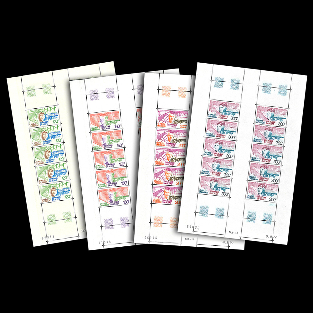 N°TCHAD77-LIND4F : Tchad 1977 - Série de 4 feuillets de 10 valeurs Poste Aérienne 120F, 150F, 200F, 300F “50e anniversaire de la traversée de l’Atlantique Nord par Charles Lindbergh 1927-1977“