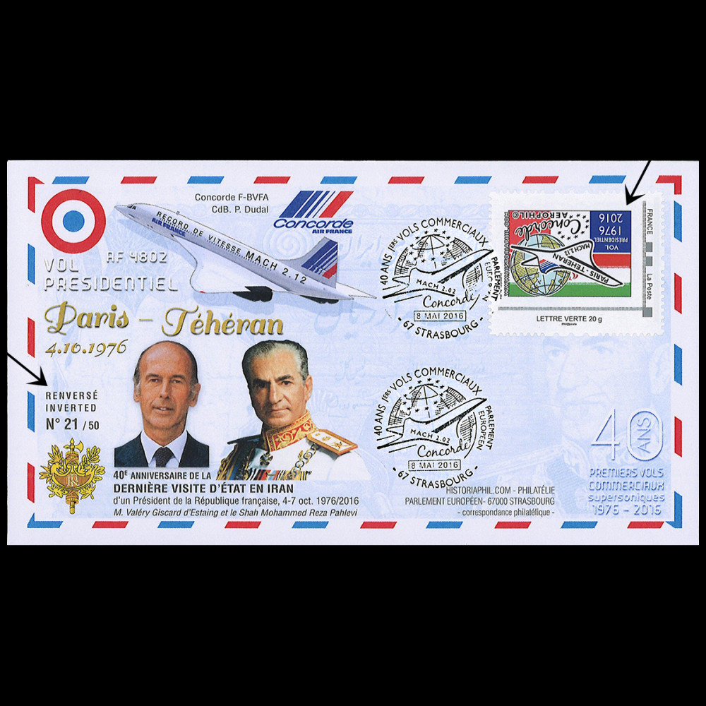 Affranchissement FRANCE timbre personnalisé (TPP) 20g Lettre verte VARIÉTÉ IMAGE RENVERSÉE “Concorde, 40 ans vol présidentiel Paris-Téhéran 1976/2016“