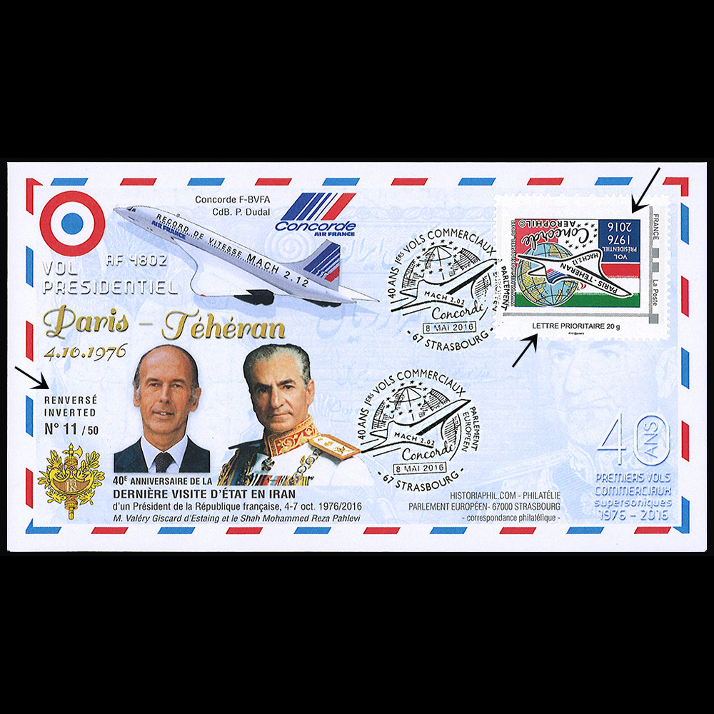 Affranchissement FRANCE timbre personnalisé (TPP) 20g Lettre Prioritaire VARIÉTÉ IMAGE RENVERSÉE “Concorde, 40 ans vol présidentiel Paris-Téhéran 1976/2016“