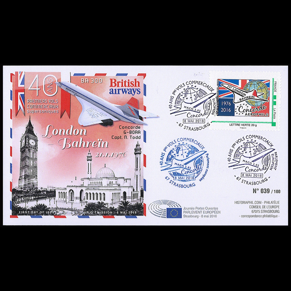 Dans le cadre du 40e anniversaire des premiers vols commerciaux du supersonique franco-britannique Concorde, les Editions Historiaphil© (Kiosque de Philatélie du Parlement européen), avec le soutien du Parlement européen, de La Poste et de l’Association philatélique UNION 1877, ont présenté une exposition philatélique temporaire durant la journée des Portes Ouvertes du Parlement européen de Strasbourg du 8 mai 2016, prolongée lors de la session plénière du 9 au 12 mai 2016. Elle est intitulée “il y a 40 ans, CONCORDE faisait entrer l’Europe dans l’ère de l’aviation commerciale supersonique (1976-2016)“.
