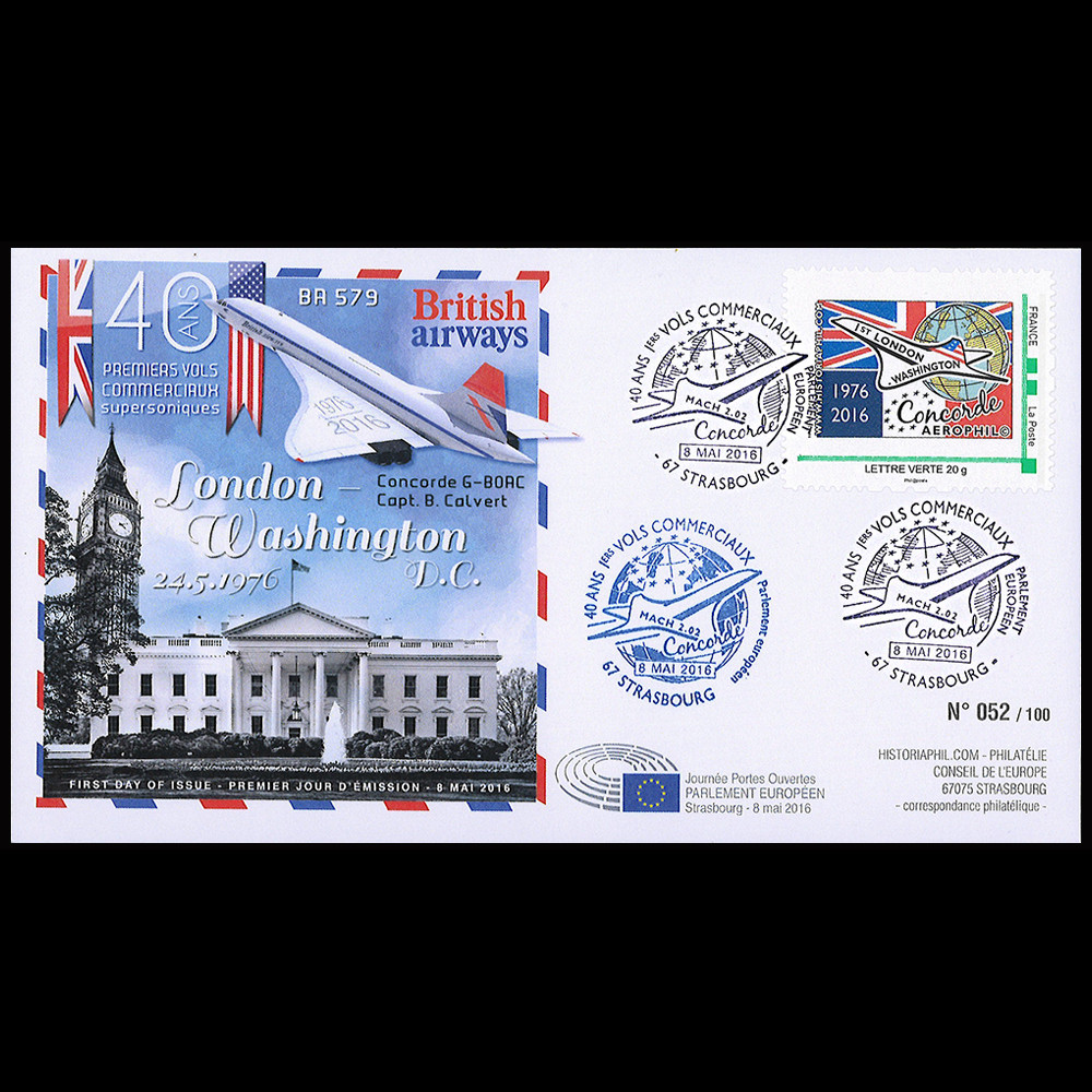 Dans le cadre du 40e anniversaire des premiers vols commerciaux du supersonique franco-britannique Concorde, les Editions Historiaphil© (Kiosque de Philatélie du Parlement européen), avec le soutien du Parlement européen, de La Poste et de l’Association philatélique UNION 1877, ont présenté une exposition philatélique temporaire durant la journée des Portes Ouvertes du Parlement européen de Strasbourg du 8 mai 2016, prolongée lors de la session plénière du 9 au 12 mai 2016. Elle est intitulée “il y a 40 ans, CONCORDE faisait entrer l’Europe dans l’ère de l’aviation commerciale supersonique (1976-2016)“.