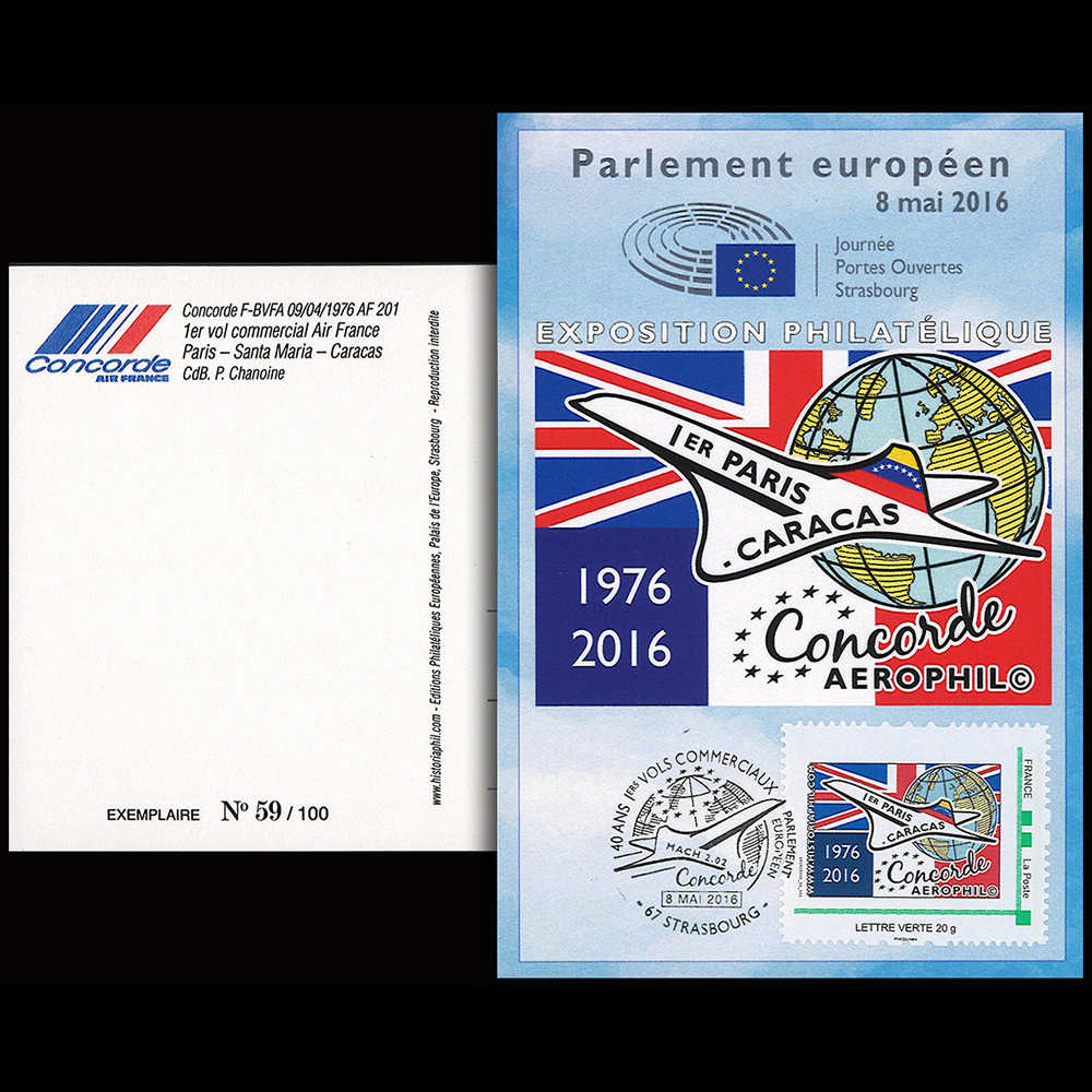 Dans le cadre du 40e anniversaire des premiers vols commerciaux du supersonique franco-britannique Concorde, les Editions Historiaphil© (Kiosque de Philatélie du Parlement européen), avec le soutien du Parlement européen, de La Poste et de l’Association philatélique UNION 1877, ont présenté une exposition philatélique temporaire durant la journée des Portes Ouvertes du Parlement européen de Strasbourg du 8 mai 2016, prolongée lors de la session plénière du 9 au 12 mai 2016. Elle est intitulée “il y a 40 ans, CONCORDE faisait entrer l’Europe dans l’ère de l’aviation commerciale supersonique (1976-2016)“.