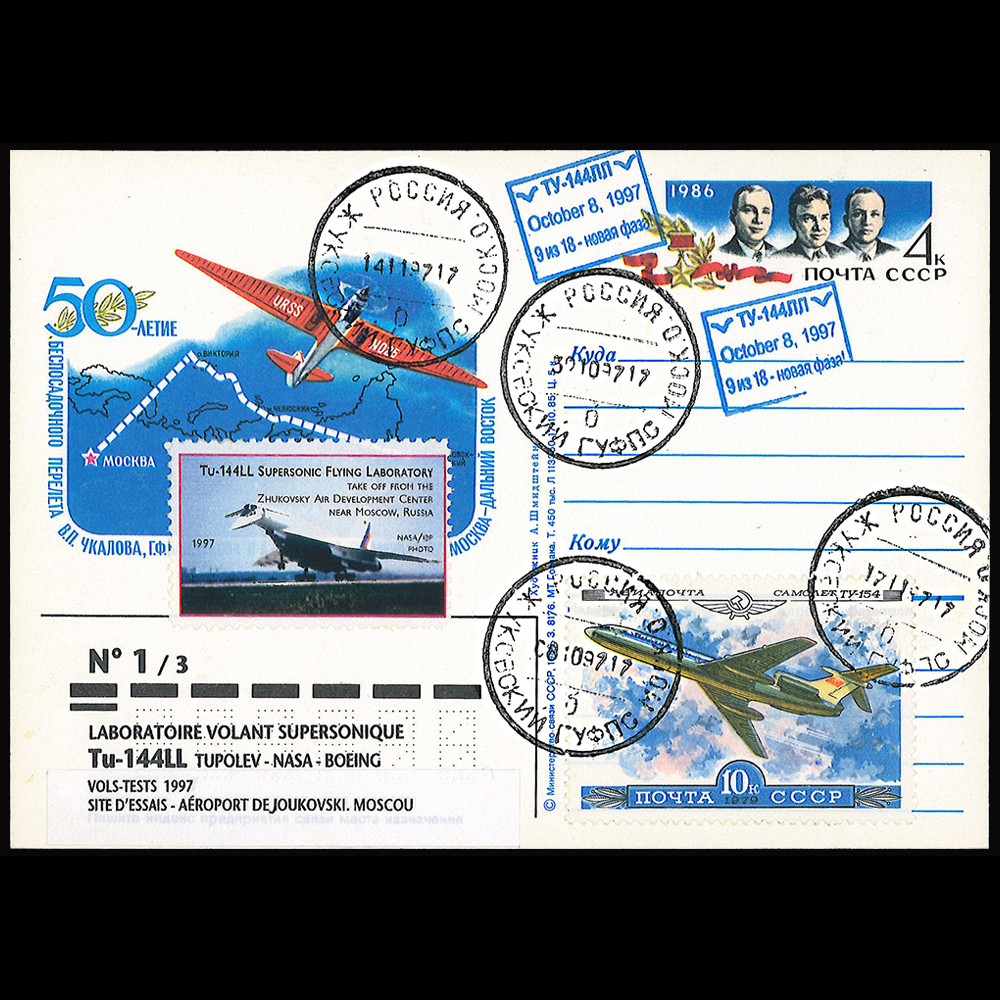 - cachet bleu Russe "TU-144LL 8 octobre 1997, Vols N°9 à N°18 nouvelle Phase" (en cyrillique)