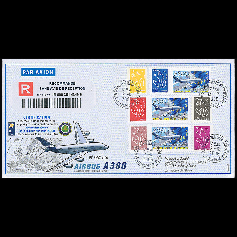 - Affranchissement France série des 3 RARES timbre-poste personnalisés ADHÉSIFS TVP (lettre 20g), 0,60 EUR et 0,86 EUR "Marianne de Lamouche" avec grande vignette "Certification de l'Airbus A380, 12 Décembre 2006 - Vaisseau Amiral de l'Europe" (YT 3802Ab, 3966A, 3969A) + complément "Marianne".