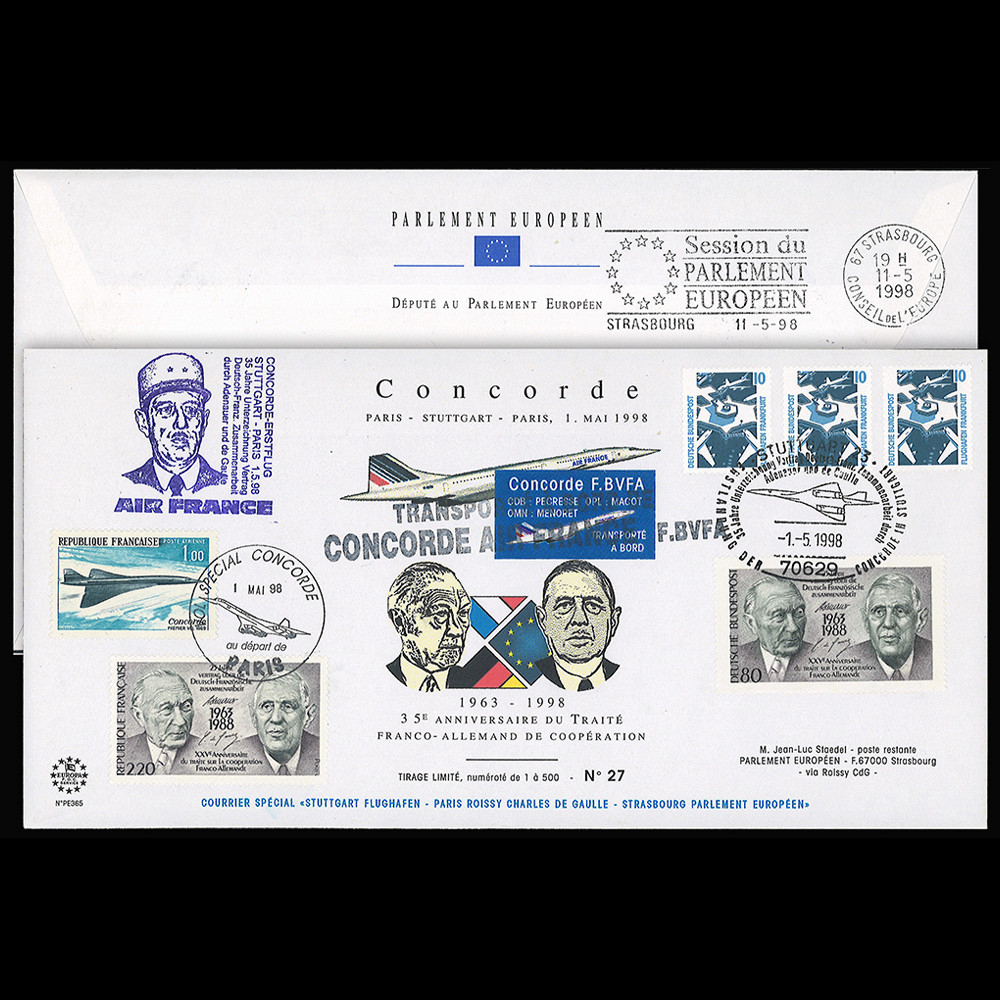 - Départ Allemagne : 80Pf “Traité sur la Coopération Franco-Allemande, de Gaulle - Adenauer (1988)", 3 x 10Pf "Aéroport Frankfurt" - Oblitération illustrée Stuttgart "Concorde / 1er atterrissage de Concorde à Stuttgart - 35e anniversaire de la signature du Traité franco-allemand de coopération par de Gaulle et Adenauer" 01.05.1998