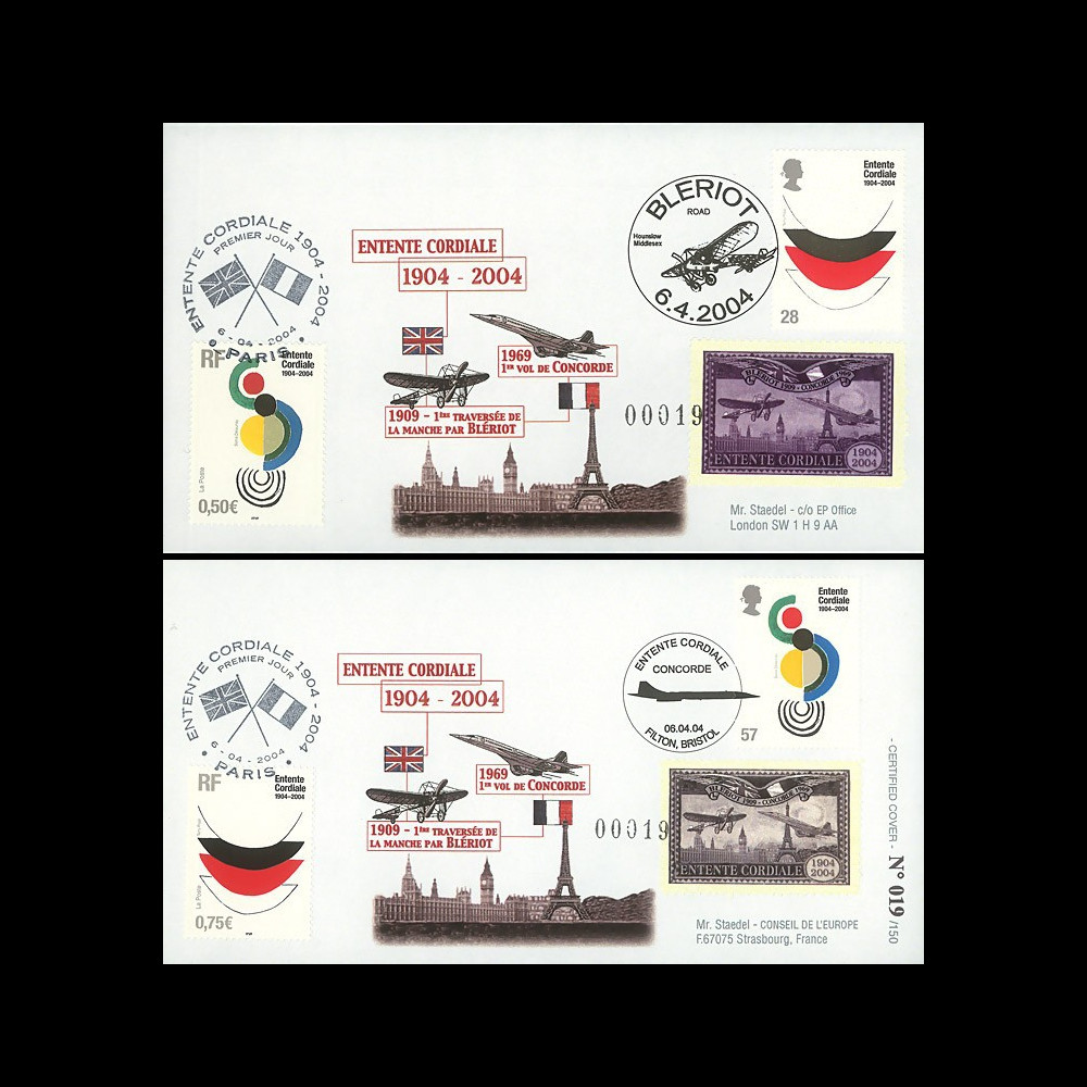 Pour commémorer le centenaire de l’Entente Cordiale, la France et la Grande-Bretagne ont choisi d’émettre chacun un timbre représentant une oeuvre contemporaine. Pour les Français, il s’agit de «Coccinelle», une oeuvre de Sonia Delaunay et pour les Britanniques, «Lace I (Trial Proof)» de Terry Frost. Quant au centenaire de la traversée de la Manche par Louis Blériot, il a été marqué par l’émission française, le 25 juillet 2009, d’un timbre de poste aérienne, de vignettes aériennes et de plusieurs oblitérations spéciales.