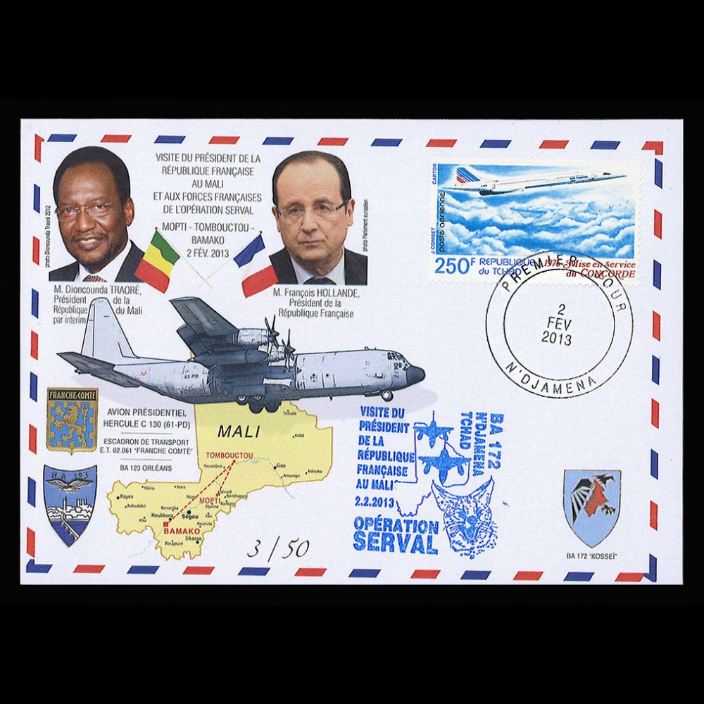 N°MALI13-16 : FDC TCHAD "02.02.2013 : Visite officielle de M. François HOLLANDE, Président de la République française au Mali et Rencontre avec M. Dioncounda TRAORÉ, Président de la République du Mali - Avion Présidentiel HERCULE C-130 (61-PD) / Base Aérienne (BA) 172 'SGC ADJI KOSSEÏ' à N'Djamena (Tchad) - Escadron de Transport E.T. 02.061 'Franche-Comté' engagé dans l'Opération SERVAL Mali 2013 / Intervention des Forces Françaises au Mali" 2013 :