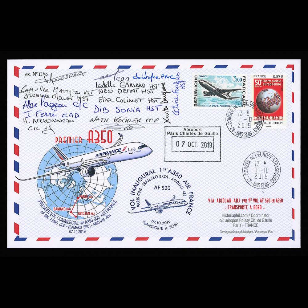Depuis le 7 octobre 2019, la compagnie Air France utilise six fois par semaine son premier A350-900 baptisé « Toulouse » entre sa base à Paris-CDG et les aéroports de Bamako-Modibo Keita et d’Abidjan-Félix Houphouët Boigny, afin de parfaire la formation des équipages. L’appareil configuré pour accueillir 34 passagers en classe Affaires, 24 en Premium et 266 en Economie, décolle tous les jours sauf jeudi à 10h10 pour arriver à 13h50 dans la capitale du Mali, en repartir à 15h00 et se poser à 16h35 ; les vols retour quitteront la Côte d’Ivoire à 18h50 puis Bamako à 22h50 pour se poser le lendemain à 6h10 à Paris.Ces vols Air France en A350-900 vers les deux destinations en Afrique se poursuivront jusqu’au 8 décembre, puis reprendront le 10 février 2020 pour la saison estivale.En commémoration des 50 ans du 1er vol de Concorde à MACH 1, les éditions Historiaphil ont conçu une série de trois timbres personnalisés émis le jour anniversaire du 1er octobre 2019, à l’occasion d’une exposition philatélique organisée au Conseil de l’Europe (Strasbourg, France).Ces timbres furent utilisés sur des plis “Premier Jour“ transportés à bord du 1er vol de l’A350 Air France AF520 Paris - (Bamako)- Abidjan du 7 octobre 2019.