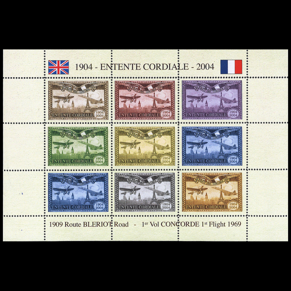 N°EC04-1V2 : FRANCE 2004 - Sheetlet of 9 perforated and gummed labels /cinderelas (Type 2 - TROPICAL GUM and large print) "1904-2004 : 100th anniversary of the Cordial Agreement between France and United Kingdom / 1909 : BLERIOT Road - 1969 : First Flight Supersonic Aircraft CONCORDE / Eiffel Tower, Paris (France) & Big Ben, London (United Kingdom)" (Size : 13,4 x 20 cm)