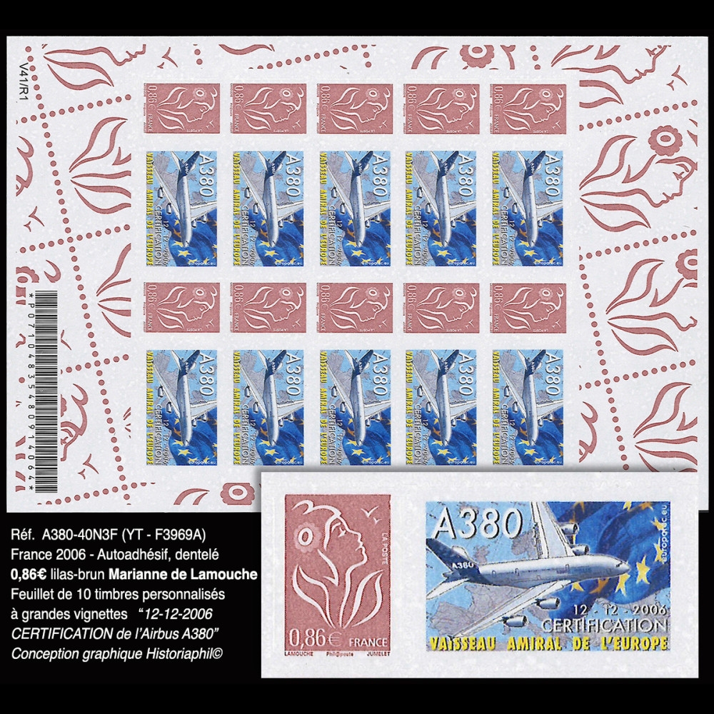 N°A380-40N3F : FRANCE 2006 - FEUILLET COLLECTOR de 10 TIMBRES PERSONNALISÉS ADHÉSIFS 0,86€ lilas-brun "Marianne de Lamouche" à grande vignette attenante "12.12.2006 - Remise du Certificat de navigabilité de l'Airbus A380 - Navire Amiral de l'Europe" (Yvert et Tellier F3969A / cote 2023: 170€)