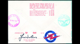 - 6 signatures authentiques des pilotes, du Canadian Air Attache de la formation des «Red Indians» R.C.A.F. Leader J. A. Graham, No. 2 R. N. Shaw, No. 3 P. W. S. Deacon, No. 4 S. A. Jones, Solo D. J. Leonard, Canadian Air Attache A. J. Bauer + sign. Cdt RAF Museum au verso