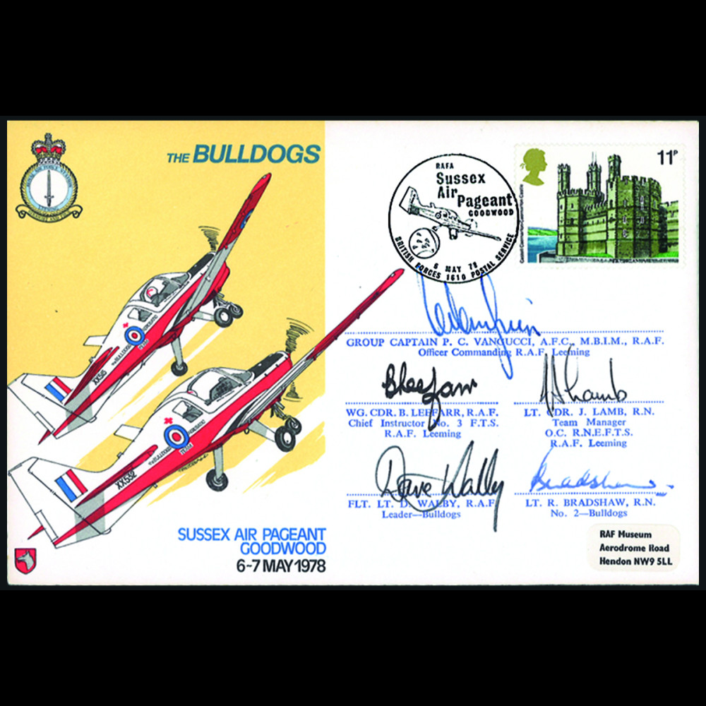 - 5 signatures authentiques des 2 pilotes, du Chef Instructeur, du Manager et du Commandant de la formation des «Bulldogs» Officer Commanding P. C. Vangucci, Leader D. Walby, No. 2 R. Bradshaw, Chief Instructor B. Leefarr, Team Manager J. Lamb + sign. Cdt RAF Museum au verso + certificat