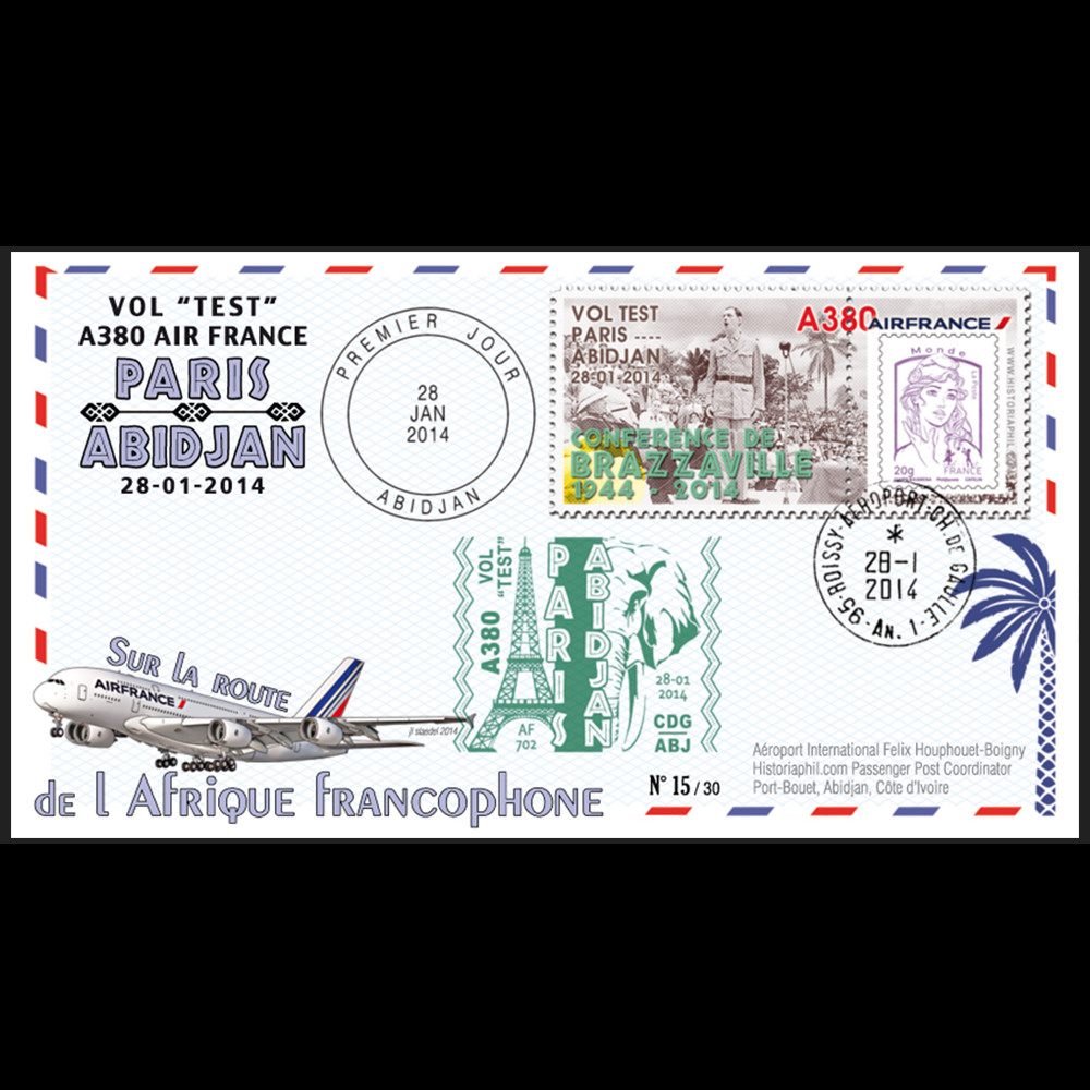 - Affranchissement France 20g Monde “Marianne et l’Europe“ sur porte-timbre BRUN “70e anniversaire de la Conférence de Brazzaville - Discours du Général DE GAULLE, 1944 - VOL TEST A380 Paris - Abidjan 2014“