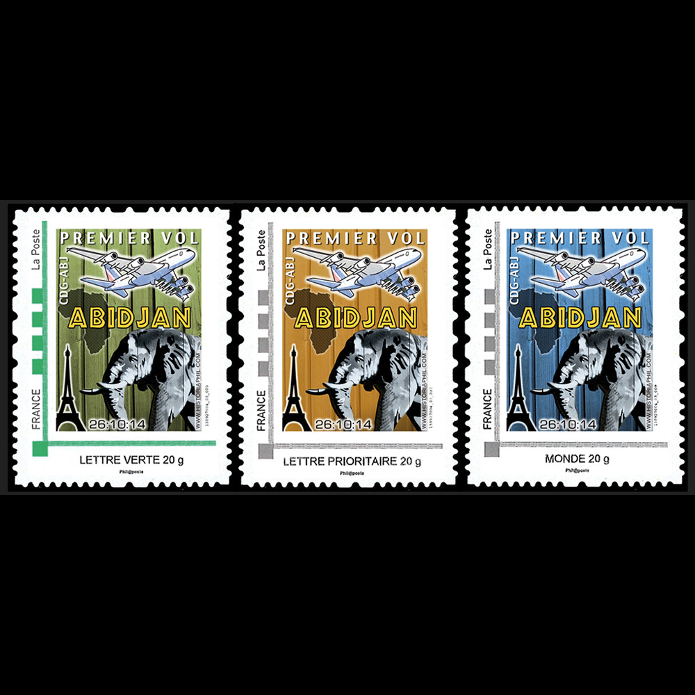A380-255-257N : FRANCE, série de 3 timbres personnalisés (TPP) 20g Lettre Verte, 20g Lettre Prio, 20g Monde “1er vol A380 Air France Paris CDG - Abidjan ABJ 26.10.2014 - Tour Eiffel, Eléphant et carte d’Afrique““
