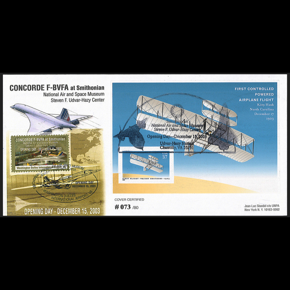 Le 12 juin 2003, le “Concorde F-BVFA“ de la flotte Air France, effectuait son dernier vol de retrait depuis l’aéroport de Roissy CdG à destination du Smithonian National Air & Space Museum de Washington DC (USA), où il sera remis solennellement pour y être définitivement exposé. Une série de souvenirs philatéliques exclusifs, émis lors de la Journée Portes Ouvertes du "Smithonian" le 15 décembre 2003, commémore ce dernier vol.